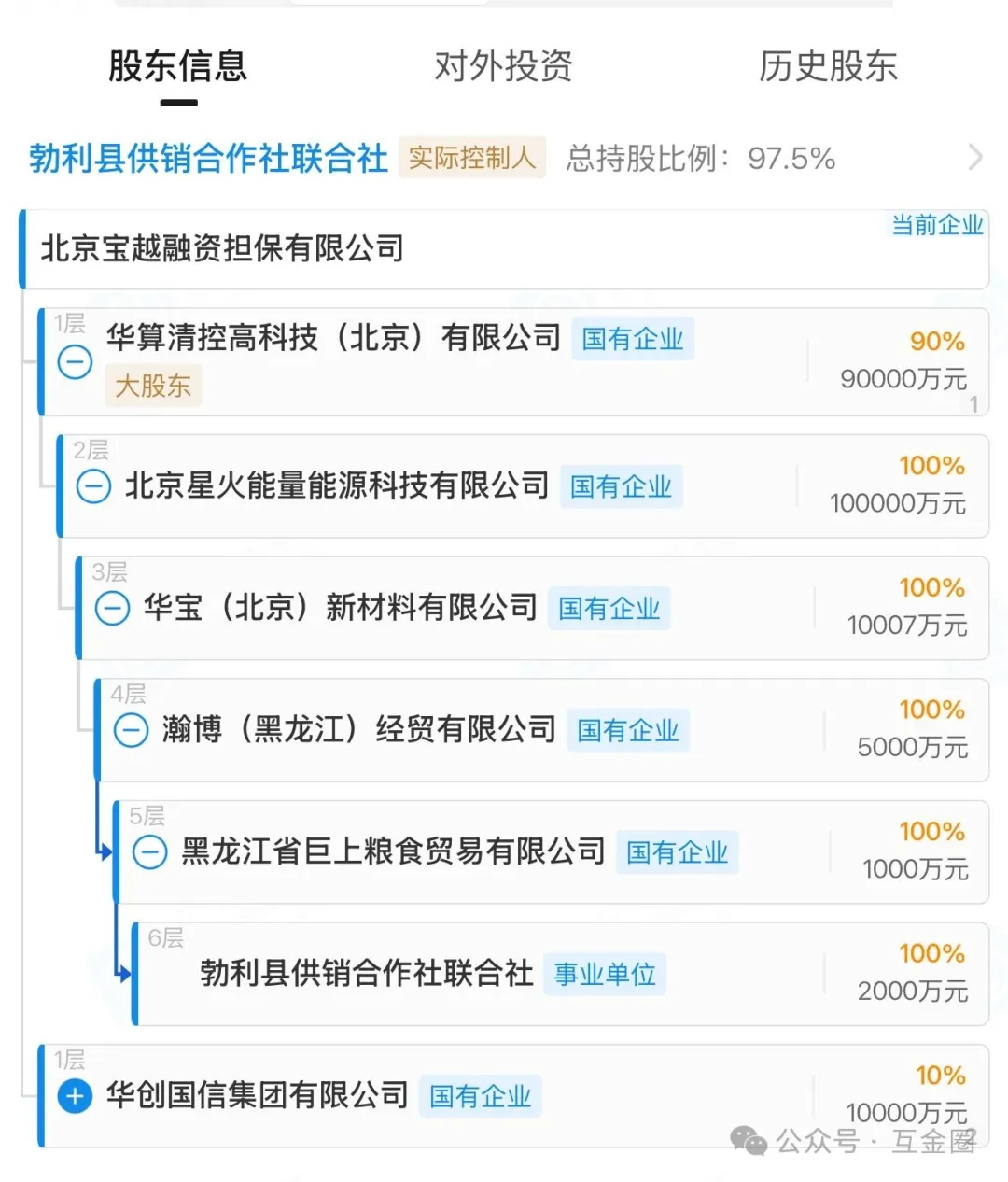 企查查显示,“宝越融担”由华算清控高科技(北京)有限公司(持股:90%)与华创国信集团有限公司(持股:10%)共同持有,实际控制人为勃利县供销合作社联合社(总持股比例:97.5%)。
