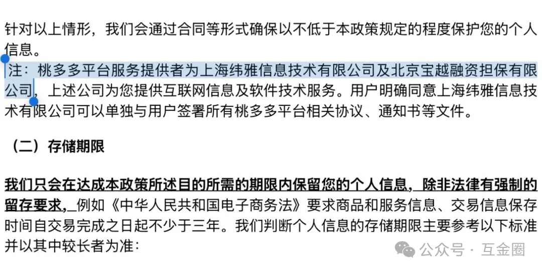 《隐私协议》显示「桃多多平台服务提供者为上海纬雅信息技术有限公司(简称“纬雅”)及北京宝越融资担保有限公司」。