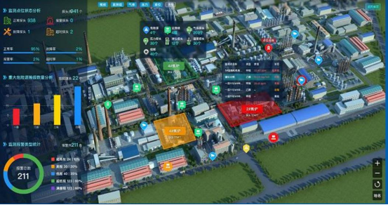 实现生产经营单位基本情况、装置开停车、化工产业聚集区安全风险分区、重大危险源、安全风险隐患、报警分布、特殊作业、人/车/物流、公共区域异常情况、应急救援等多形式、多模式、多维度的可视化综合展示、统计分析、监测预警。