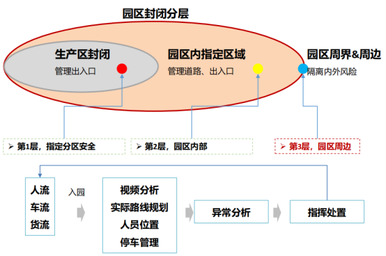 ➢ 以园区的周界和地理信息为基础,通过在园区设置电子围栏、人/车/物管控、定位和轨迹管理、门禁管理、入侵和紧急报警、视频监控系统,在园区周界形成闭合区域。建立电子巡查系统,巡查过程可以在二维或三维电子地图上对出入人员、车辆、物流的身份进行实时跟踪、展示、记录保存与统计分析。对访客进行在线管理,支持在线预约,预约审批通过后的访客人员和车辆信息自动发送至被授权的出入口,对访客区域授权、异常行为和黑名单进行管理。