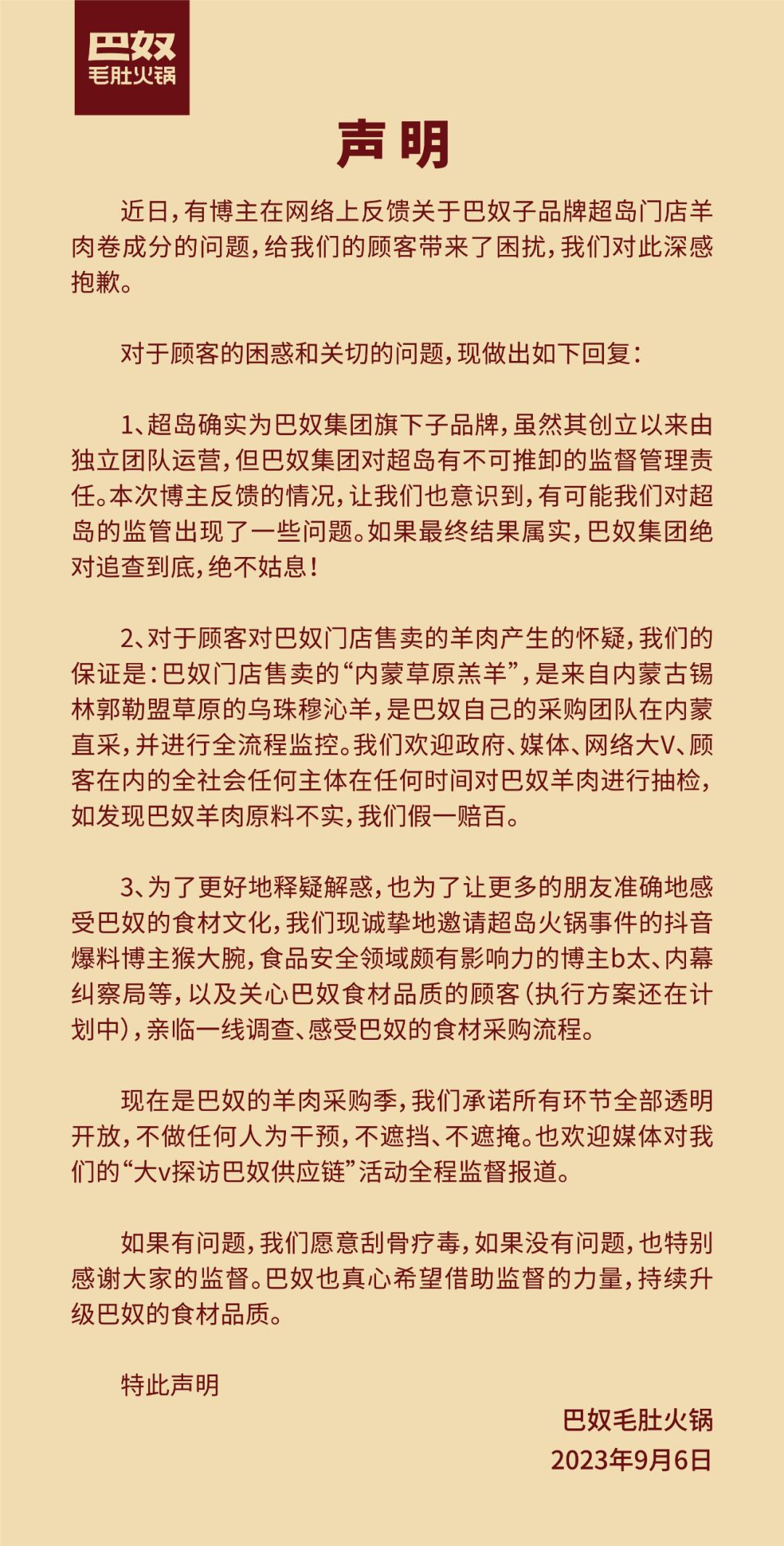 对此,巴奴毛肚火锅发布声明表示,超岛确实为巴奴集团旗下子品牌,本次博主反馈的情况,让公司也意识到,有可能对超岛的监管出现了一些问题。如果最终结果属实,巴奴集团绝对追查到底,绝不姑息。