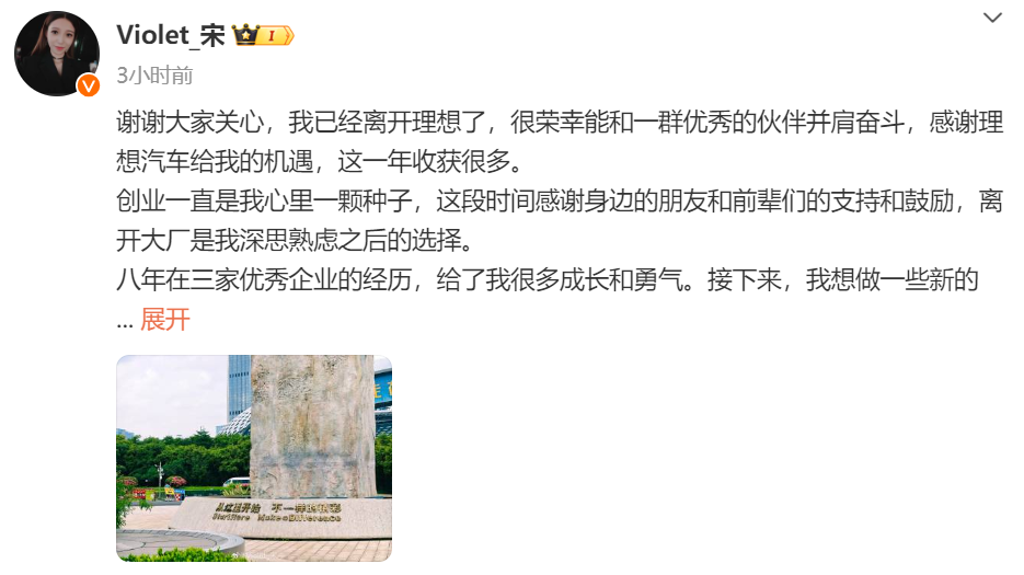紫金财经10月8日消息 宋紫薇微博发文表示,已经离职理想汽车,并且表示离开大厂是经深思熟虑后的选择。