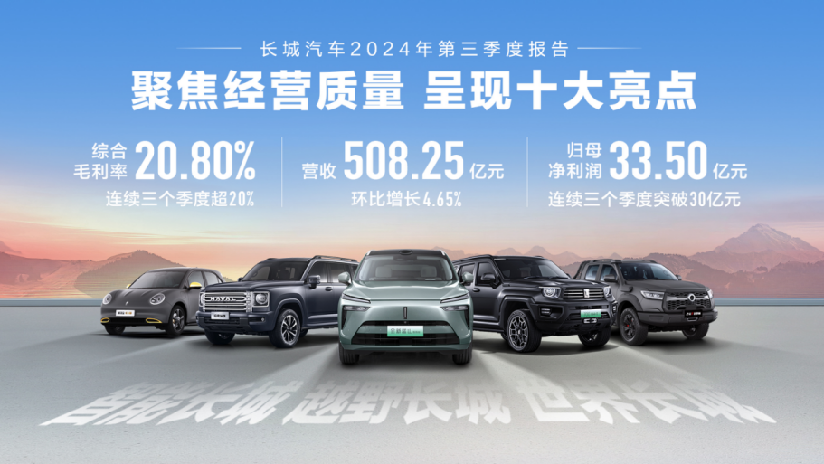 2024年第三季度,长城汽车营收508.25亿元,环比增长4.65%;综合毛利率20.80%,连续三个季度超20%;归母净利润33.50亿元,连续三个季度归母净利润突破30亿元;新能源车型销售7.91万辆,环比增长8.10%;海外销售12.27万辆,同比增长39.85%;20万元以上车型销售7.20万辆,同比增长8.92%。