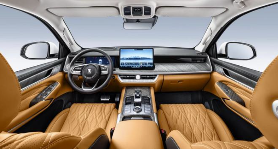 内饰方面,中控台整体富有层次感,车内注重装饰,颜色高雅。车内配备12.3英寸全液晶仪表盘、抬头显示、14.6英寸多媒体中控屏、流媒体内后视镜,提供Coffee OS 3.0智能座舱,采用Nappa真皮座椅,前后排座椅提供加热与通风功能,前排座椅配备按摩功能。