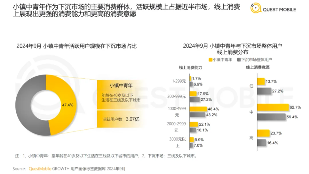 小镇青年在消费,城市青年在节俭,是县域正在上演的真实剧情。近日,QuestMobile发布的《2024年小镇中青年消费洞察报告》(下称《报告》)指出,得益于县域经济的稳步提升,“小镇中青年”们正走到台前,成为县域消费升级的中坚力量。