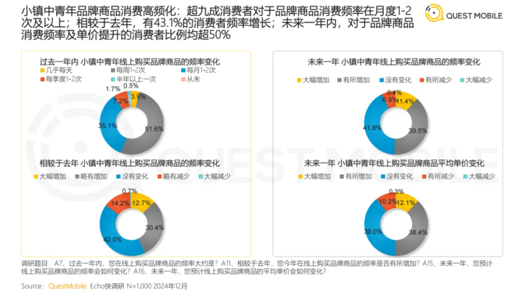 《报告》指出,小镇中青年品牌商品消费高频化,超九成消费者对于品牌商品消费频率在月度1-2 次及以上;相较于2023年,有43.1%的消费者频率增长。另外,小镇中青年白牌消费者占比16.5%,逐步向品牌消费升级,新增品牌需求主要通过综合电商渠道购买,且未来一年品牌商品购买频率增加的比例大幅提升。
