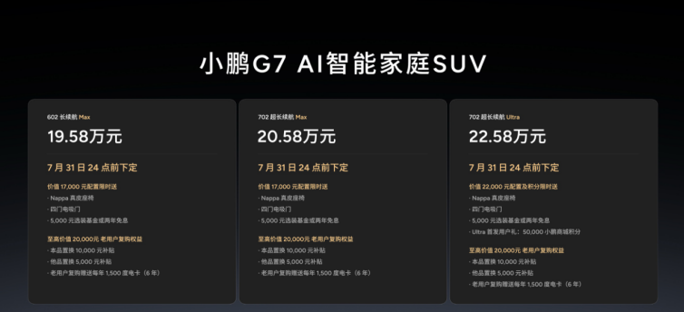 小鹏G7共推出602长续航Max、702超长续航Max、702超长续航Ultra三个版本,官方指导售价分别为19.58万元、20.58万元和22.58万元,上市即刻可以交付。