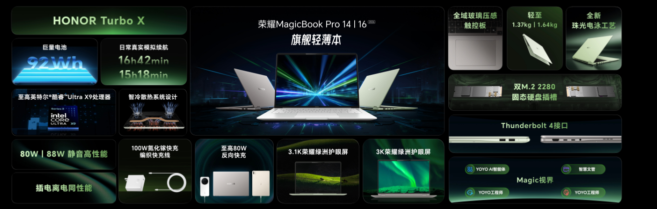 如果说游戏本是性能的竞赛,那么轻薄本就是能效比的较量。荣耀MagicBook Pro系列2026款在这次发布会上展示了一个令人惊讶的数据:续航全面超越苹果MacBook Pro。
