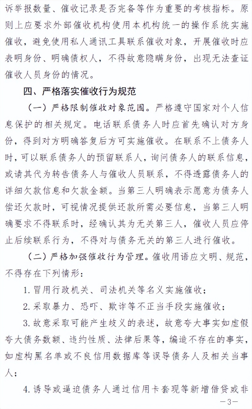 其中包括:将外部催收机构的投诉举报数量、催收记录是否完备等作为重要的考核指标。原则上应要求外部催收机构使用本机构统一的操作系统实施催收,避免使用私人通讯工具联系催收对象,开展催收时应表明身份、明确债权人,不得故意隐瞒身份,出现无法查证催收人员身份的情况。