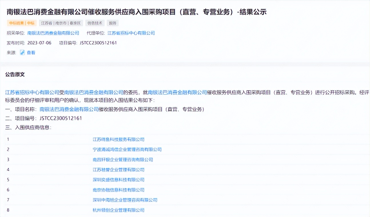 消金公司催收供应商名单:南银法巴消金59家入围 中邮消金99