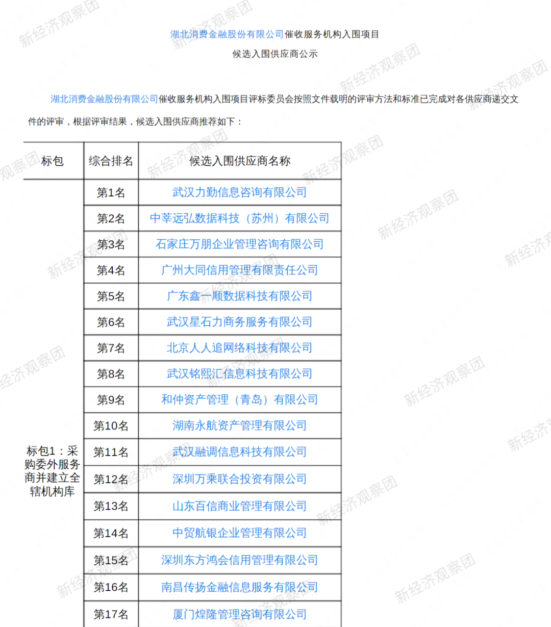 在更早前的2月份,湖北消金公布的《湖北消费金融股份有限公司催收服务机构入围项目招标中标候选人公示》显示,约38家催收机构入围。