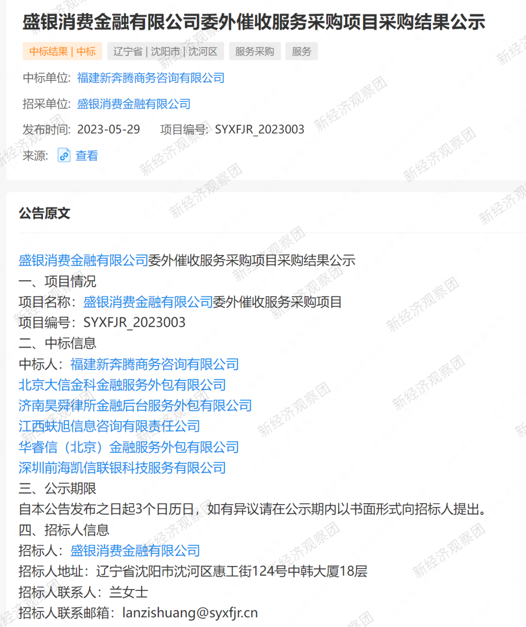 盛银消金:6家催收机构中标