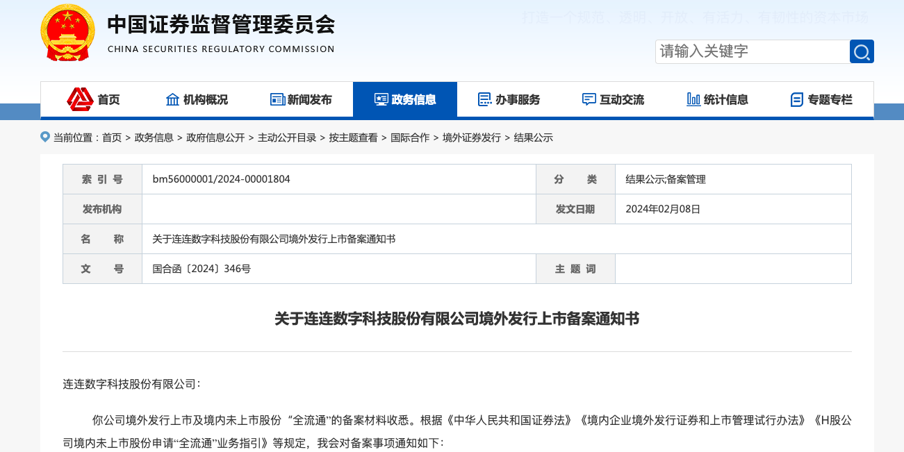 在首次启动赴港IPO半年后不久,连连数字科技股份有限公司(以下简称“连连数字”)迎来新进展。2月18日,证监会国际合作司发布了关于连连数字境外发行上市备案通知书,连连数字拟发行不超过2.059亿股境外上市普通股并在香港联合交易所上市。