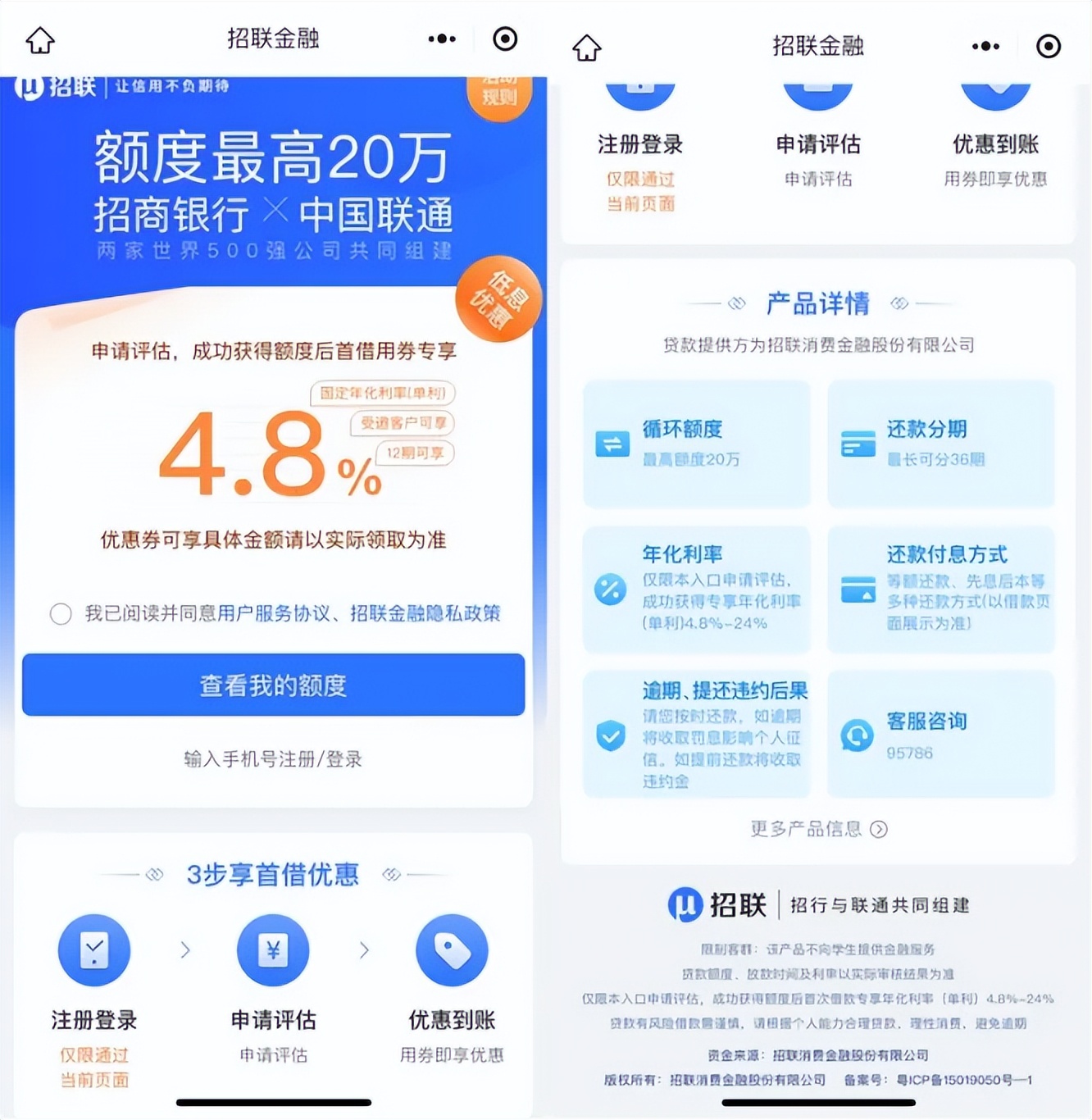 不过,实际情况是,新用户想要享受优惠利率,还要接受各种限制。招联消费金融相关条款显示,新客户4.8%的贷款利率,仅面向受邀用户,而且还款分期要达到12期才可享受。此外,在常规的逾期还款需要承担后果之外,提前还款同样需要承担后果,也即缴纳提前还款违约金。