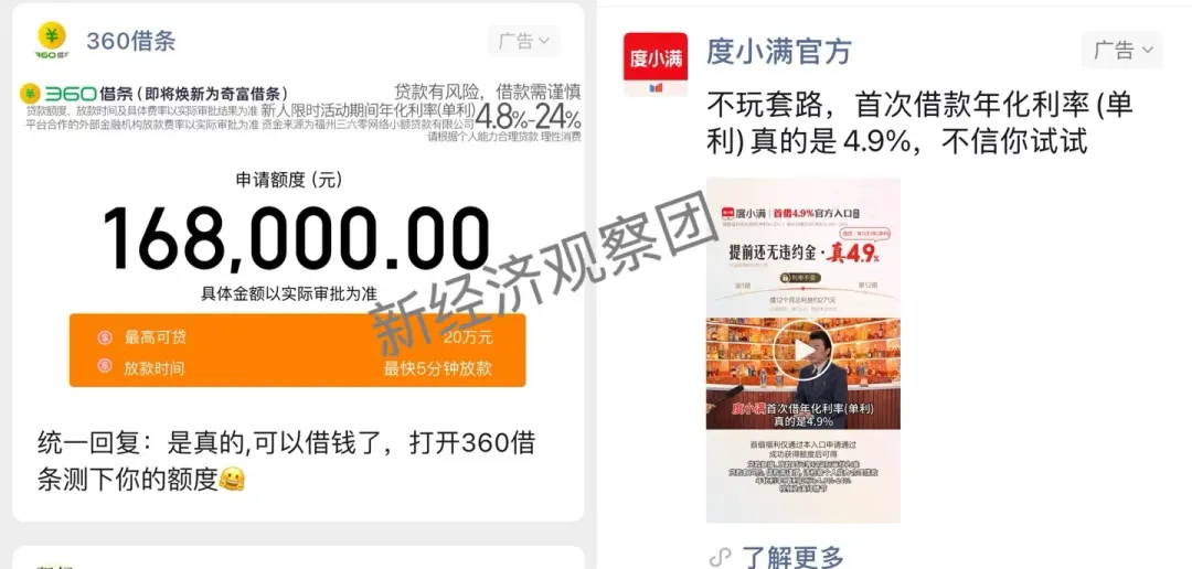 与此同时,头部金融科技公司的利率折扣也在加大。新经济观察团统计发现,近期360数科打出的获客广告最低利率为4.8%、乐信旗下的分期乐也是4.8%、度小满首借最低则为4.9%,与持牌消金机构几乎不相上下。