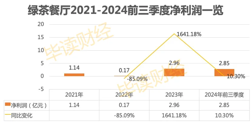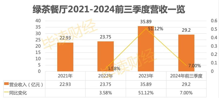 招股书显示,2021-2023年间,绿茶的营业收入分别为22.93亿元、23.75亿元和35.89亿元;同期净利润则为1.14亿元、1657.9万元和2.96亿元。值得注意的是,2022年绿茶净利润出现大幅回落,此外,虽然2023年的营业收入同比增长了超过50%,但这一增长主要是由于疫情防控政策调整后餐饮市场的恢复性反弹所致。