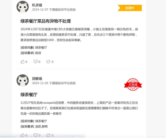 为了改善现状,绿茶已经开始采取行动,比如计划自建预制菜供应链,预计该设施产生的约90%半加工食品将供应全国餐厅,其余10%则出售给消费者。但截至目前,绿茶仍然备受预制菜的困扰,根据黑猫投诉平台内容,消费者投诉案例达到189件,有多起案例显示,绿茶餐厅存在吃出异物、服务流程混乱、等待时间过长等问题,这些问题进一步削弱了顾客好感度,同时也将预制菜供应链的隐忧再次摆到台前。