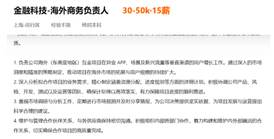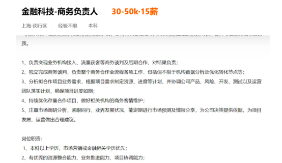其中,追觅发布的“金融科技-商务负责人”职位,月薪达30-50K,职责包括“负责变现业务机构接入、流量获客等商务谈判及后期合作”等,还需“为结果负责”。