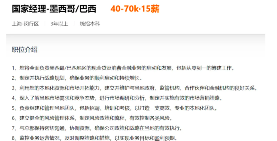 此外,公司还在招聘贷后、海外商务负责人、流量商务等岗位,金融业务布局不仅完整,而且专业。其中,墨西哥、巴西东地的现金贷及消费金融业务经理,月薪高达40-70k,意味着追觅科技将在这两地试水现金贷业务。