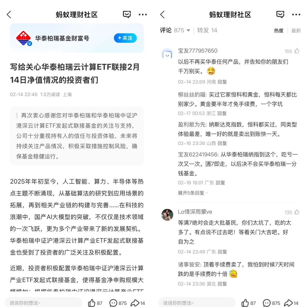 面对舆论压力,华泰柏瑞2月14日在蚂蚁理财社区发布了《写给关心华泰柏瑞云计算ETF联接2月14日净值情况的投资者们》的消息,称该联接基金因短期净申购规模激增(2024年底规模仅3700万元),新进资金稀释了原有持仓收益,导致净值涨幅与ETF出现偏差。