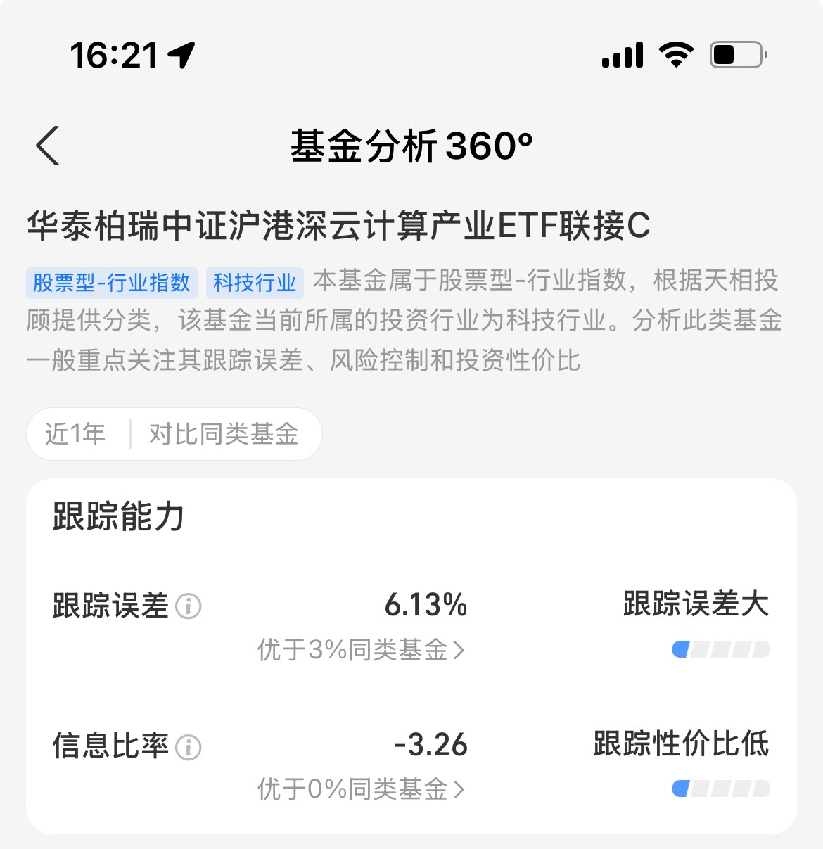 蚂蚁财富显示,该基金近一年跟踪误差达6.13%,仅优于3%的同类基金。
