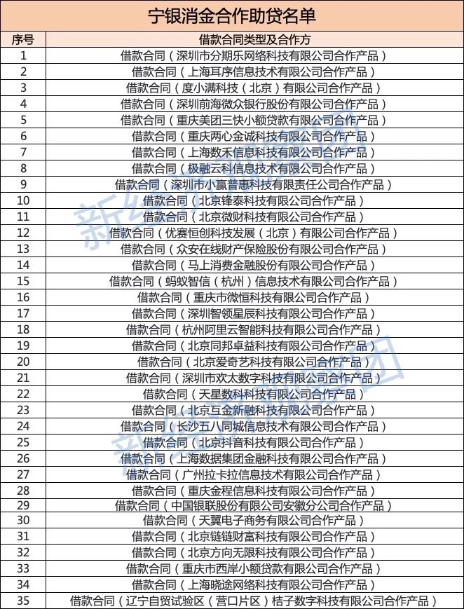 浙江宁银消费金融股份有限公司(以下简称称“宁银消金”)在官网以协议范本的形式公布了35家助贷公司的名单。