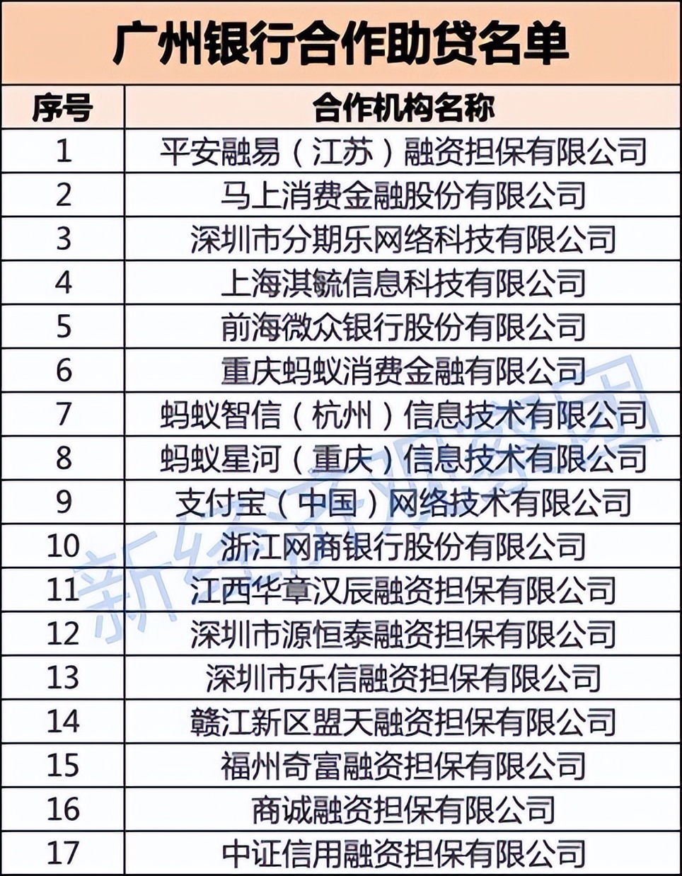 在广州银行最新公布的17家互联网贷款业务合作机构名单中,覆盖蚂蚁、奇富科技等6家头部助贷平台,也包含乐信融担、奇富融担等7家融资担保公司,以及微众银行、网商银行等持牌金融机构。