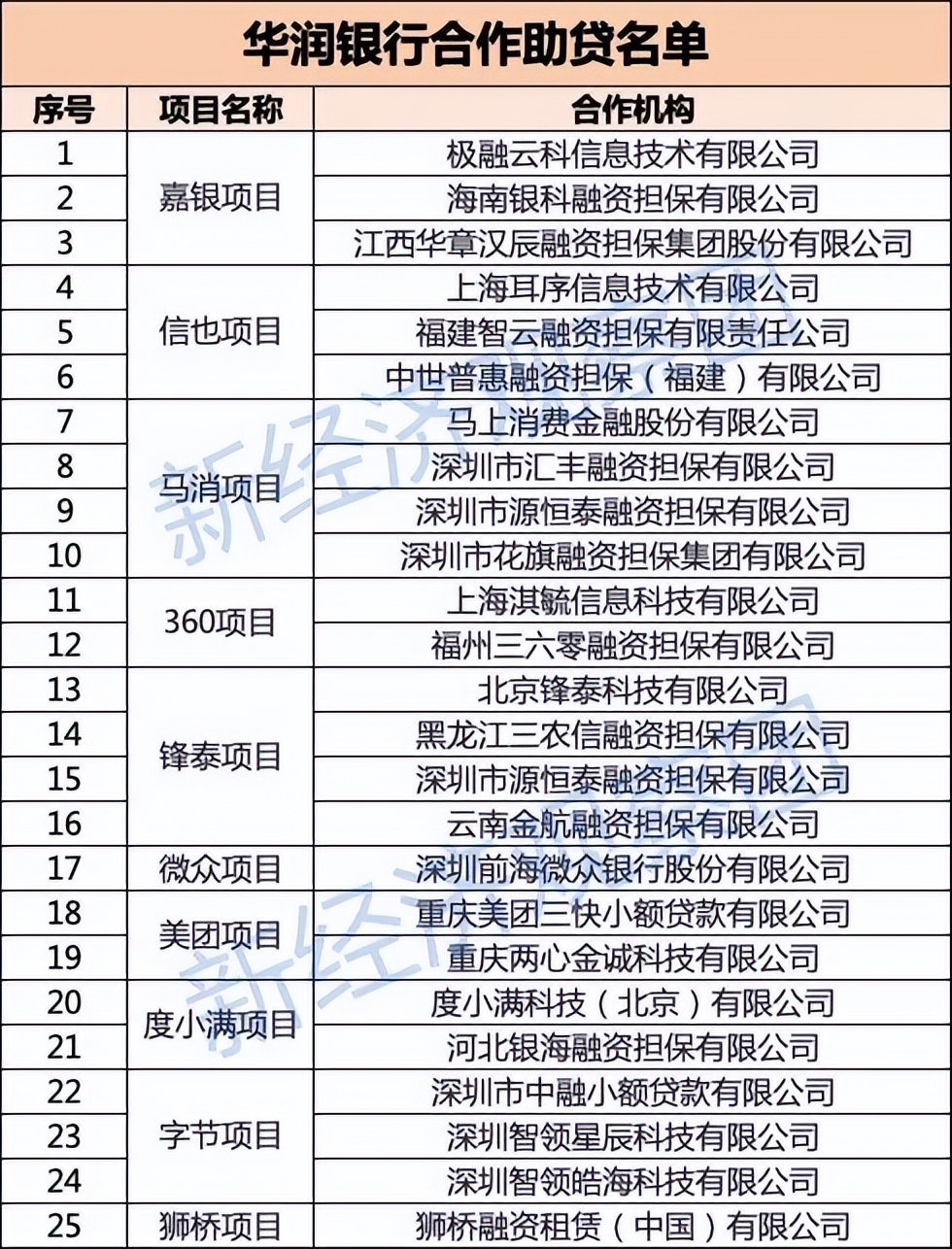 8. 华润银行:25家助贷合作方,隶属10家公司