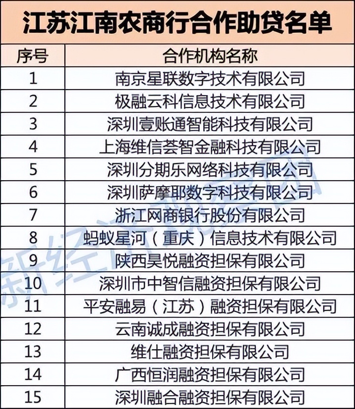 查询可知,江苏江南农商行公布了15家合作助贷机构,其中不乏极融、维信金科、分期乐等知名平台,另外还包括7家融资担保机构。