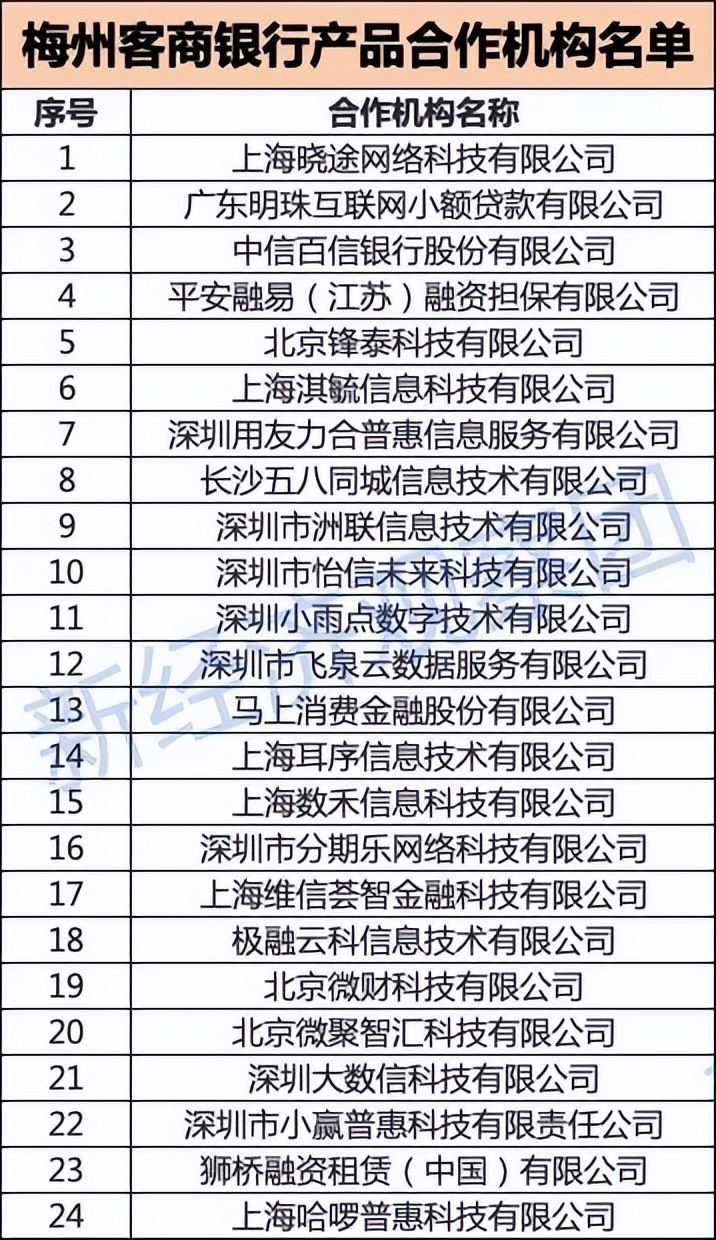 梅州客商银行也在日前发布合作机构名单,包括24家合作获客机构。其中,既有百信银行、马上消金等持牌机构;还有五八同城、哈啰等流量平台,需要指出的是,与此前金融机构相比,作为尾部民营银行的梅州客商银行,合作的头部助贷平台较少,以中部机构为主。