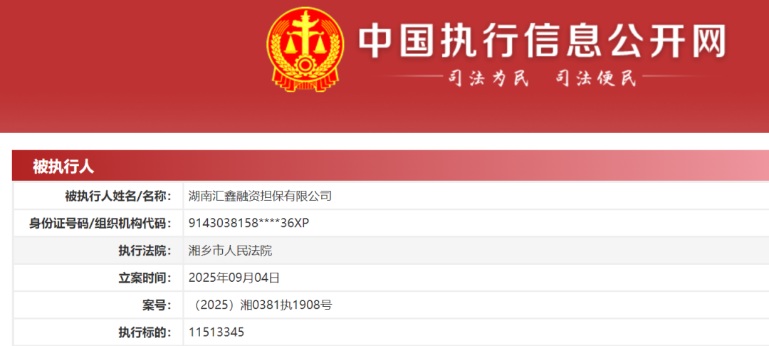 据禾金财经报道,根据中国执行信息公开网发布的信息,湖南汇鑫融资担保有限公司(下称汇鑫融担)成为被执行人,执行标的为11513345
