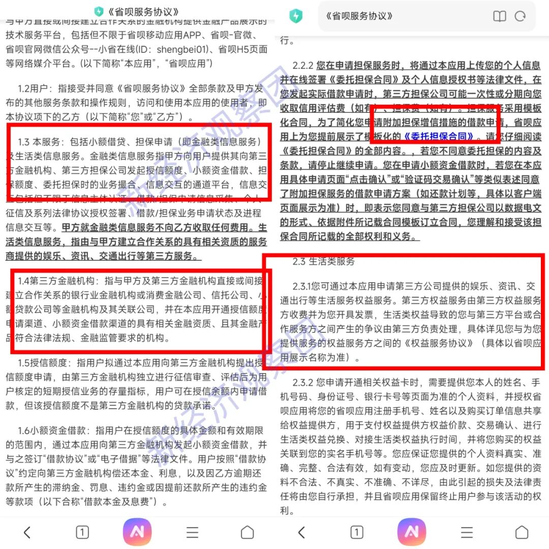 而根据省呗的服务协议,其提供的服务包括小额借贷、担保申请(即金融类信息服务)及生活类信息服务。