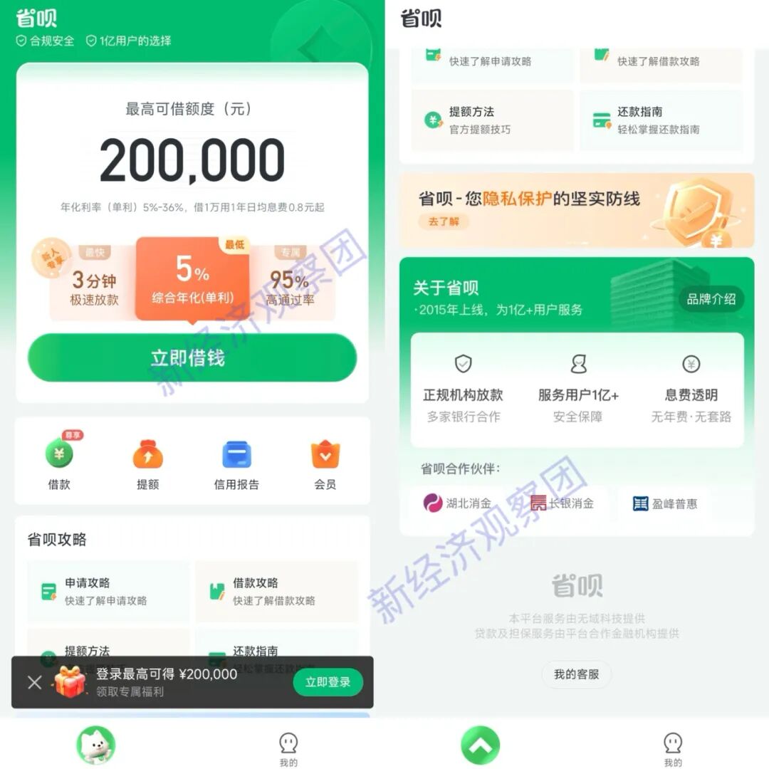 笔者下载“省呗APP”后发现,页面显示年化利率(单利)5%-36%,最高额度20万,提供借款、提额、信用报告、会员等服务,合作伙伴仅列出了湖北消金、长银消金和盈峰普惠。