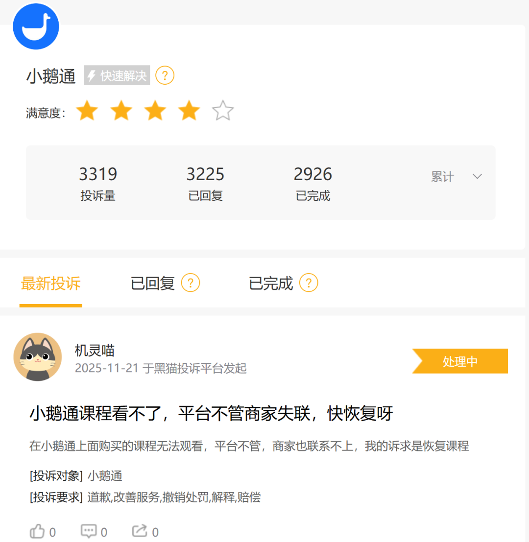 但光靠事后监管,并不能对上述侵权行为形成足够警示。根据黑猫投诉,小鹅通累计被投诉量超3300次,大量投诉指向虚假宣传、诱导付费、霸王条款、预付费不退款、课程质量差等问题。