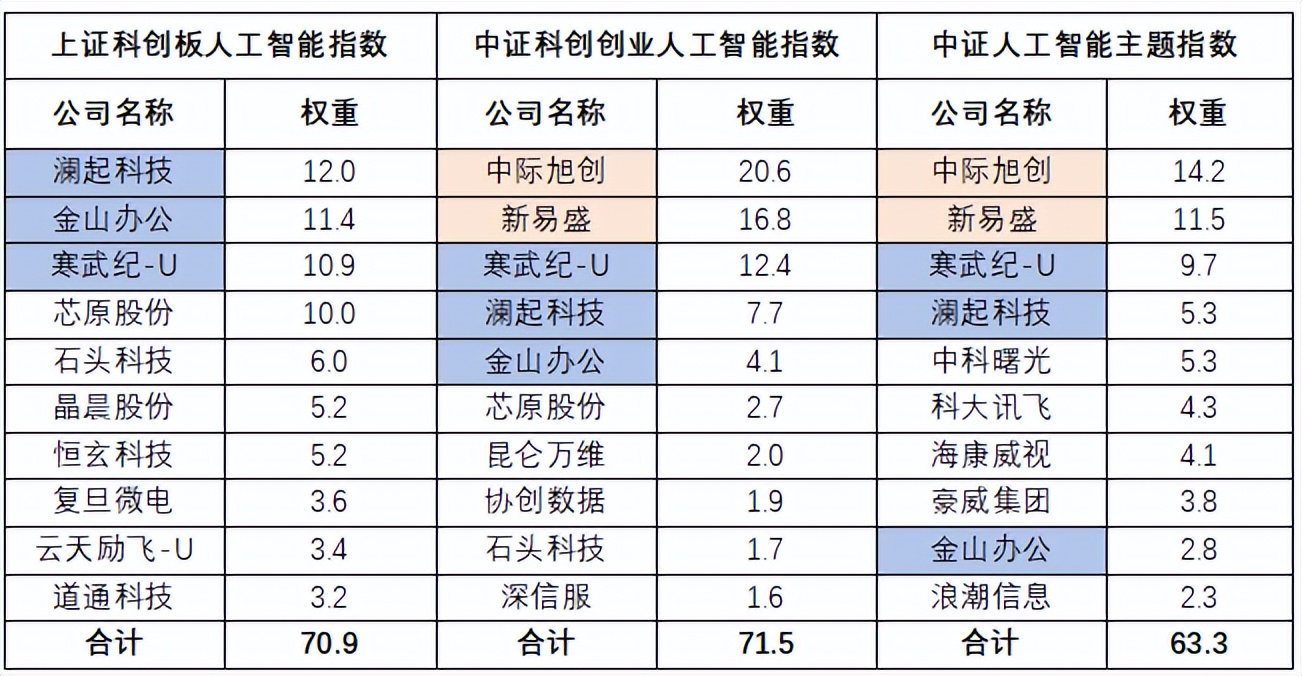 成份股方面,科创板人工智能指数的前三大权重股为澜起科技、金山办公、寒武纪。而另外两只指数因包含创业板,前两大权重股均为中际旭创和新易盛这两家通信设备龙头,在科创创业人工智能指数中合计权重达37.4%,在人工智能主题指数中为25.7%。此外,人工智能主题指数还涵盖了中科曙光、科大讯飞等主板上市的人工智能产业链公司。