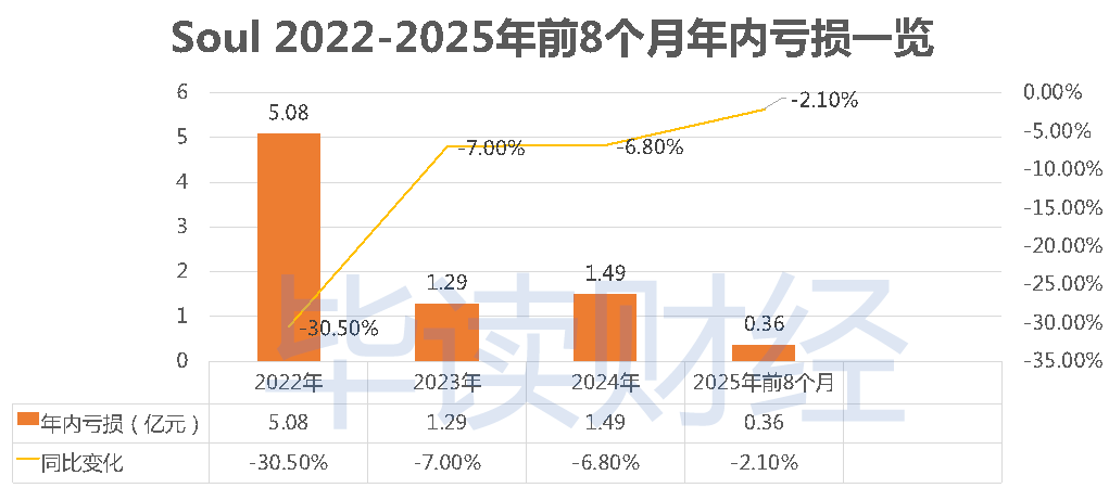 更值得注意的是,Soul自2023年起在经调整净利润(非国际财务报告准则)口径下首次实现盈利,2023年为3.61亿元,2024年为3.37亿元,2025年前8个月已达2.86亿元。然而,在国际财务报告准则下,公司同期仍处于净亏损状态,2022年、2023年、2024年及2025年前8个月的净亏损分别为5.08亿元、1.29亿元、1.49亿元和0.36亿元,三年多以来,累计亏损8.22亿元。