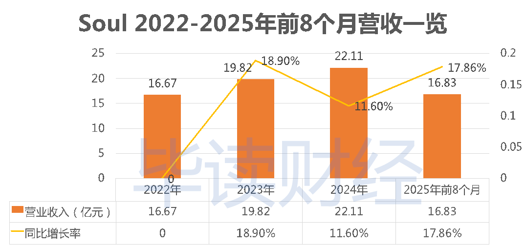 财务表现上,Soul确实在近年展现出一定的经营韧性。根据公司最新递交的港交所招股书,2022年公司营收为16.67亿元,2023年增长至19.82亿元,2024年进一步提升至22.11亿元,三年复合年增长率约15.2%。2025年前8个月,Soul营收进一步增至16.83亿元,同比增长两位数达17.86%,增速高于过去三年平均水平。