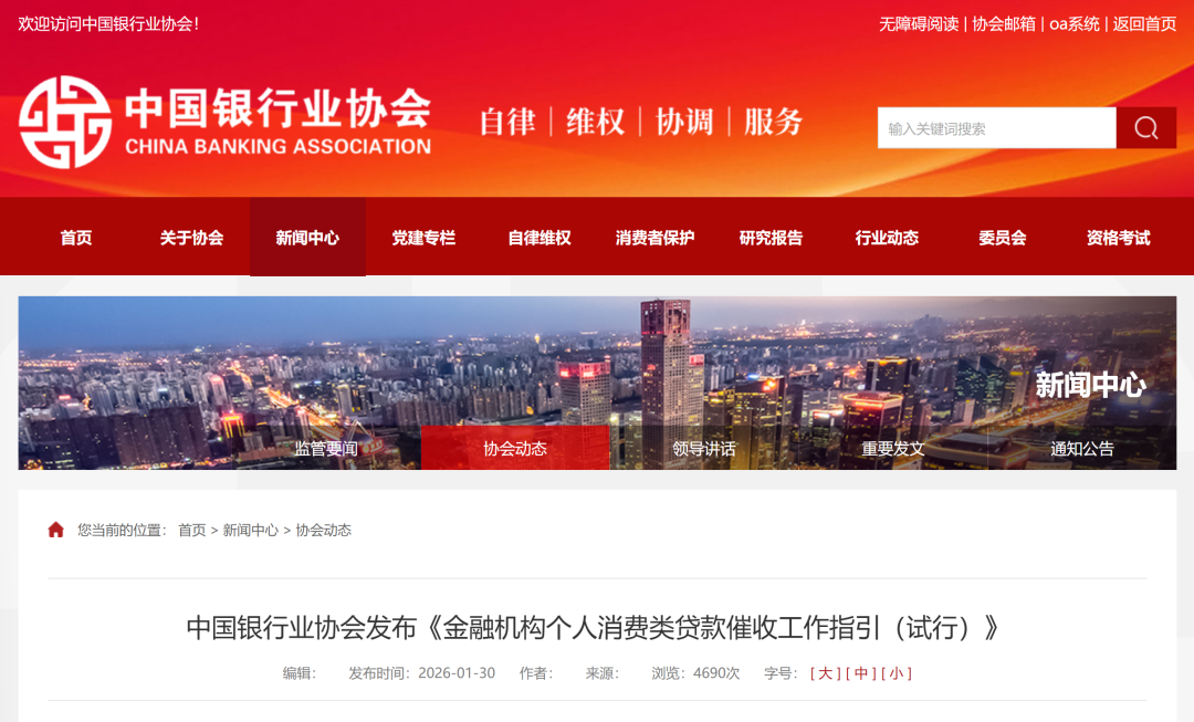 1月30日,中国银行业协会(下称“中银协”)在官网发布了《金融机构个人消费类贷款催收工作指引(试行)》的消息。