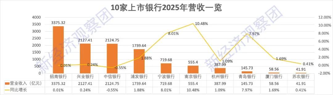 在2025年各银行营收业绩中,招商银行营收是苏农银行的80.5倍,头部银行收入体量优势显著。而南京银行、宁波银行等城商行营收增速超过8%,成为营收增长的重要力量。