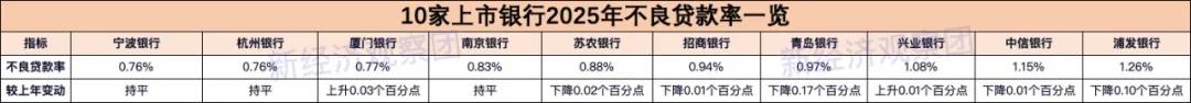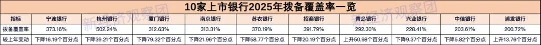 2025年,10家上市银行资产质量总体保持稳定,不良贷款率延续下行趋势,但拨备覆盖率出现明显回落,部分银行风险缓冲能力承压。