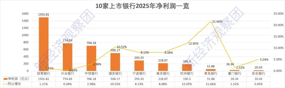2025年,10家上市银行净利润呈现全面增长、结构分化的特征,大行稳底盘,中小行冲速度,行业盈利格局更趋多元。