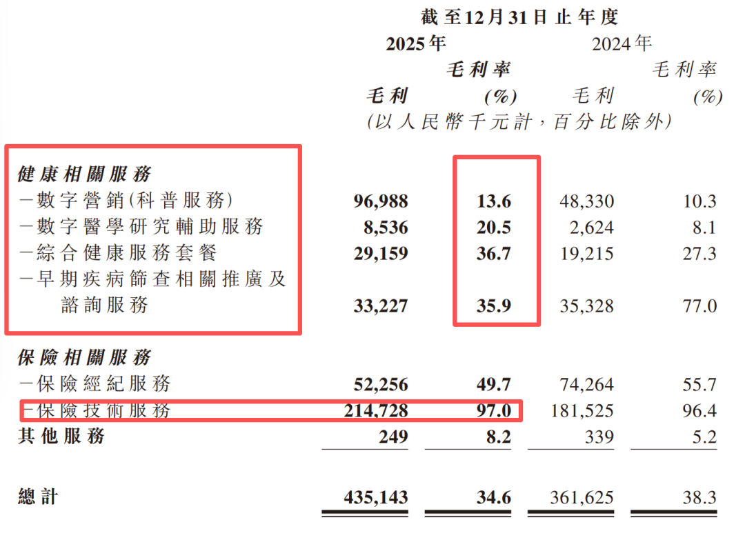 此外,用户流失对公司业务的开展产生巨大的反噬,尤其是靠走量提取业绩提成的保险业务:2022年,数字综合保险服务一度贡献了3.2亿元的营收,在总收入中占比高达81.5%,到2025年相关收入增速已经萎缩到1.6%,占总收入比重仅为26%,几乎陷入停滞。而保险服务的毛利率一直保持在90%以上,远超目前的营收支柱健康服务。