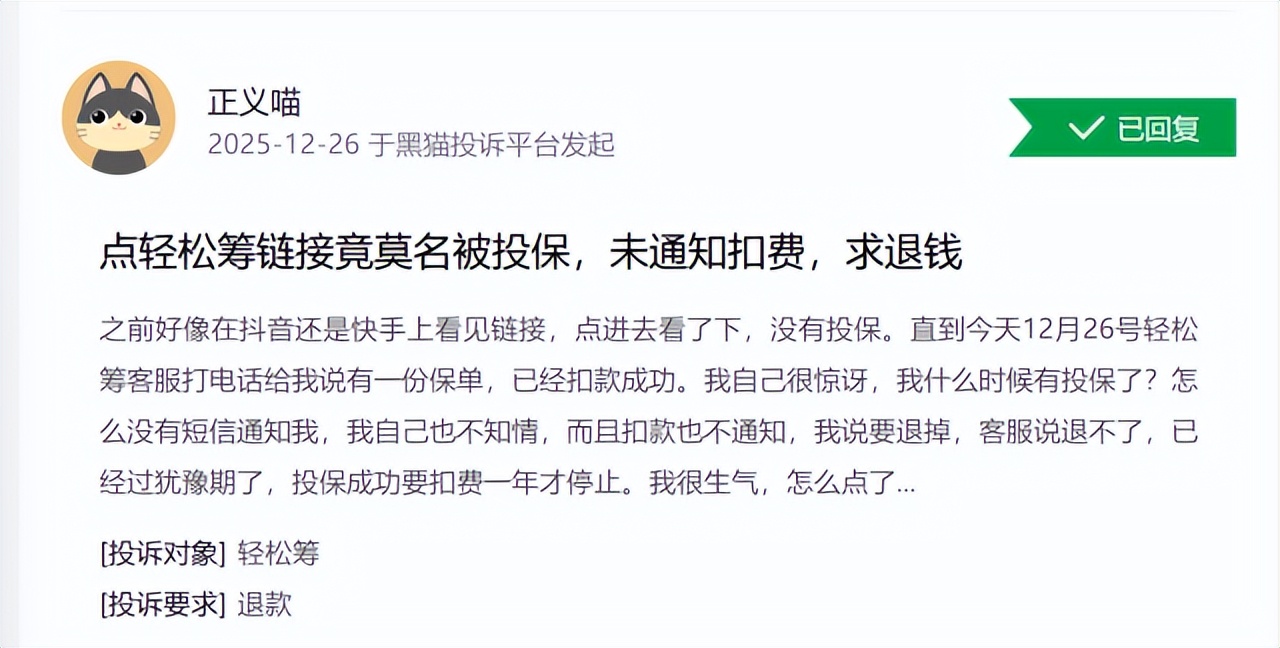而轻松筹的问题,则主要集中在点击链接后就被莫名开通保险,未沟通就自动扣费。