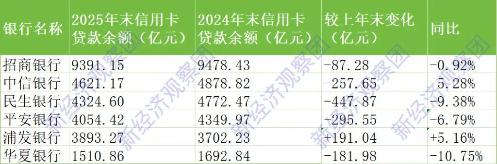 而华夏银行余额最低,且在六家中降幅最大。2025年末信用卡贷款余额 1510.86 亿元,比上年末下降10.75%,成为本轮调整中收缩力度最显著的机构。