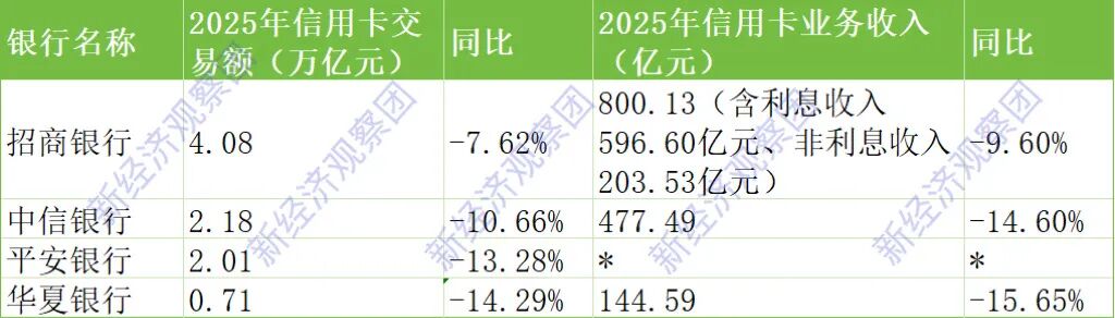 从信用卡交易额和业务收入来看,四家披露数据的股份行同样呈现承压态势。