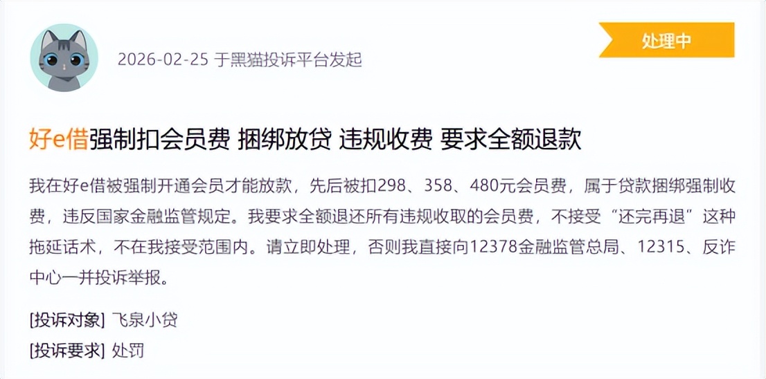移卡也不例外。其在主营业务基础上发力助贷,截至2025年末,移卡的应收贷款余额为7.27亿元,同比上涨7.18%。移卡通过全资子公司广州飞泉融资担保有限公司上线助贷产品“好e借”。但黑猫投诉上,大量用户反映“好e借”强制扣除数百元会员费、利率过高。