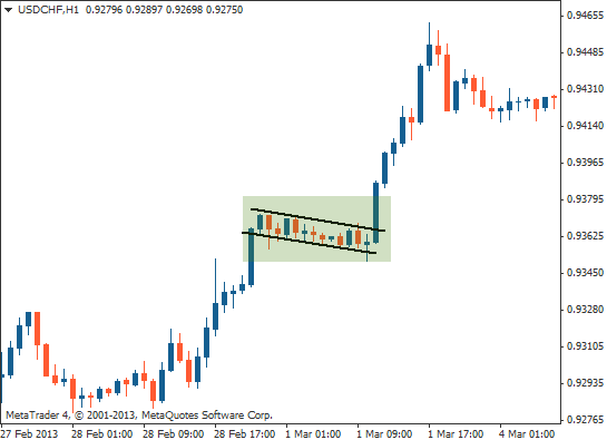 如上所示,价格经历大幅上升趋势,然后合并到缓缓向下倾斜的矩形范围中。