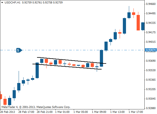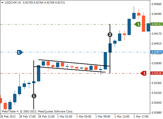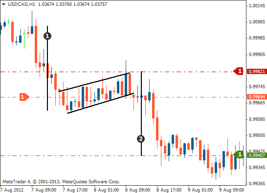 我们将在以下示例中使用看涨旗形。如要运用看跌旗形进行交易,只需反转形态和订单。