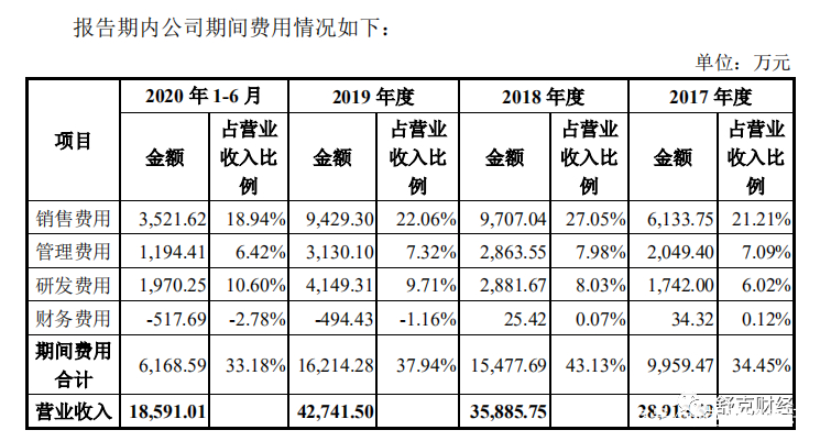此外,在研发投入少的同时,翔宇医疗的销售费用却一直居高不下。招股书显示,2017-2019年及2020年上半年,翔宇医疗销售费用分别为6133.75万元、9707.04万元、9429.30万元、3521.62万元,占营收比分别为21.21%、27.05%、22.06%、18.94%。
