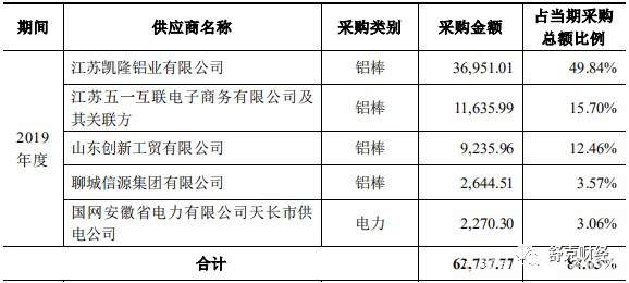 其中,2017年度-2019年度向江苏凯隆铝业有限公司的采购金额分别为3.45亿元、4.23亿元、3.70亿元,占当期采购总额高达69.57%、73.26%和49.84%。